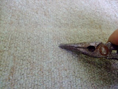 ホッチキスの針は掃除機だけでは除去しにくく、手で抜いたりこのようにペンチを使用したりして取り除きます。